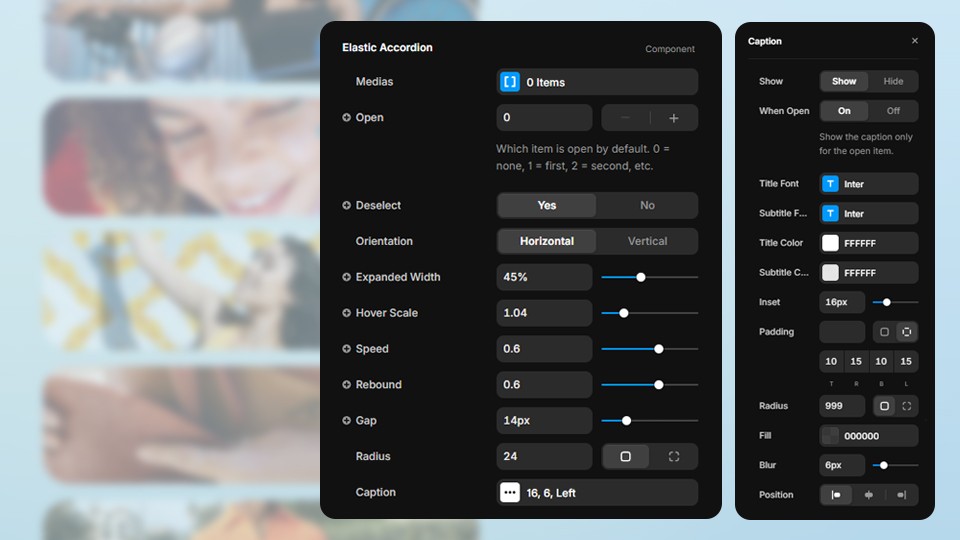 Elastic Accordion crée un accordéon d’images interactif avec des animations fluides et élastiques. Personnalisez la mise en page, le mouvement et les légendes pour des galeries dynamiques.